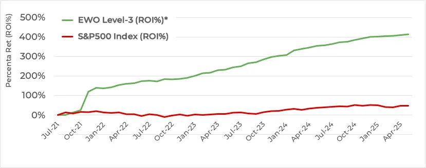 *Trade performance quoted for Rob Roy’s EWO LEVEL-3 Service based on a $10,000 Non compounding portfolio. The track records includes trades completed since AI trade selection was incorporated into the portfolio in August 2021 up until May 2025.